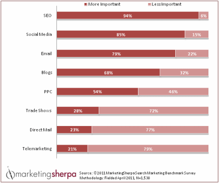 Um estudo da Marketing Sherpa mostra que SEO (sigla de Search Engine Optimization, ou Otimização para Sites de Busca) é a fonte de tráfego (ou de visitas) mais importante para 94% dos profissionais de marketing.
